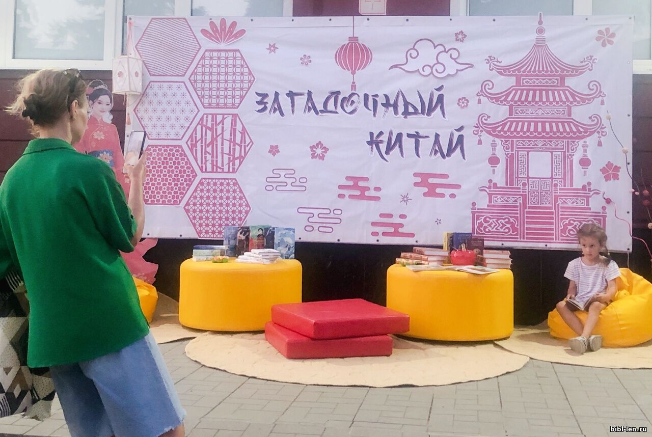 Вечерняя аллея библиотечного двора была наполнена атмосферой Востока. Яркие декорации, воссоздающие атмосферу китайского города, изящные фонарики, традиционные веера и свитки с каллиграфией, а также нежная восточная музыка, создавали умиротворяющее настроение.